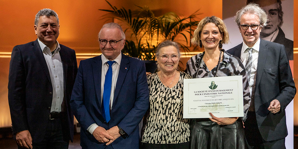 Légende de la photo en Une, de gauche à droite : Sylvain Bredin, président du comité des Arts Mécaniques ; Pierre et Christiane Riou, fondateurs de Riou Glass, Christine Riou Feron, Présidente de Riou Glass ; et Olivier Mousson, président de la Société d’Encouragement pour l’Industrie Nationale (crédit photo : Pauline de Courrèges).