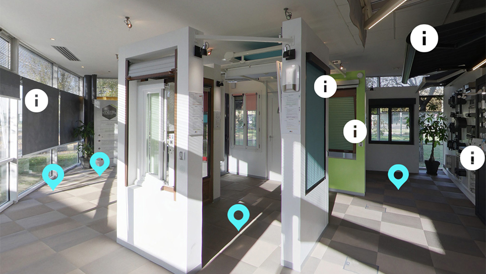 Pour parcourir le showroom, rien de plus simple. Il suffit de cliquer sur les points d’intérêt bleus matérialisés comme des indicateurs de géolocalisation et de se déplacer comme dans un magasin réel.