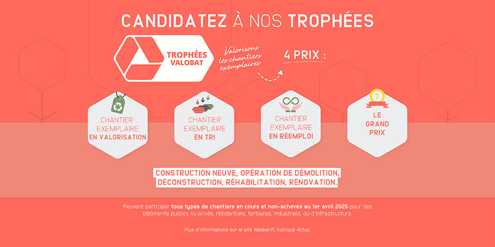 Ce concours inédit se veut une vitrine de l’économie circulaire dans le secteur du bâtiment en France. Tous les artisans, maîtres d’œuvre et d’ouvrage, négoces en matériaux de construction, gestionnaires de déchets, plateformes de réemploi, entreprises de travaux… peuvent candidater* gratuitement aux Trophées Valobat. Il leur suffit de compléter le formulaire sur le site internet de Valobat avant le 10 janvier 2025 à minuit.