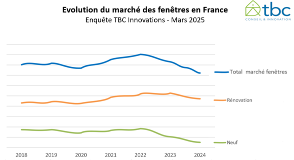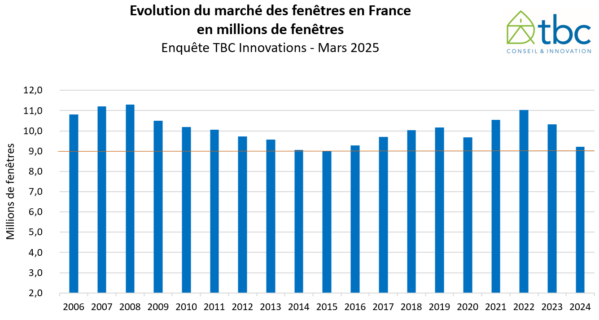 TBC Innovations estime le recul du marché des fenêtres en valeur à près de -9%, en 2024 par rapport à 2023. Le nombre de fenêtres installées en 2024 passe a un peu plus de 9 millions de fenêtres, sous la barre des 10 millions d’unités annuelles.