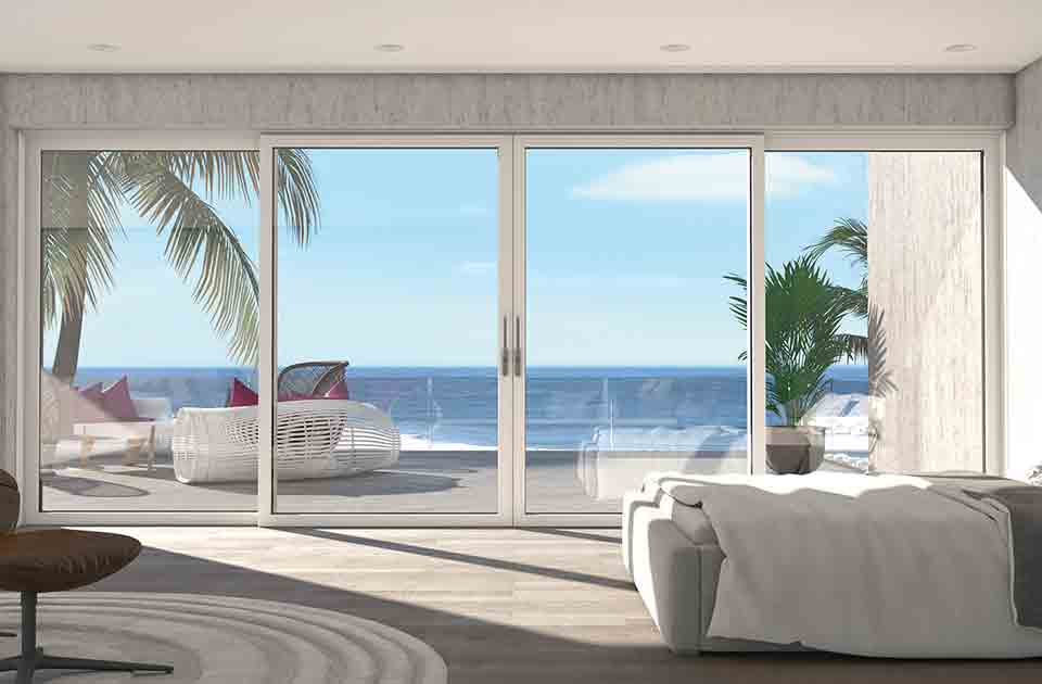 En photo ci-dessus : le système de coulissant à levage Schüco LivIngSlide, avec un nouveau profil de ventilation, de seulement 72 mm de face vue. © Schüco Polymer Technology AG.