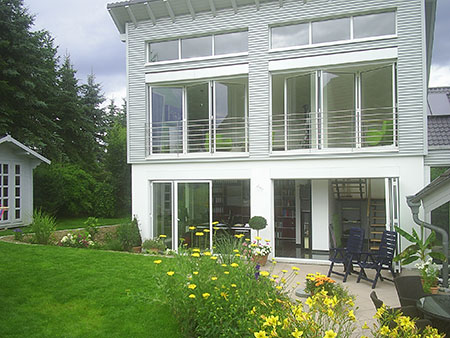 Des balcons fermés avec un vitrage supplémentaire offrent une solution confortable aux habitants de logements en ville. En été comme en hiver, les vitrages montés sur les balustrades de balcon, atténuent sensiblement les bruits ambiants. Rien qu’un système coulissant SF20 offre déjà une bonne protection contre les bruits et le mauvais temps. Cette solution convient particulièrement pour des espaces réduits, puisqu’ aucun élément n’empiète l’espace. Les systèmes pivotant coulissant, type SF25 offrent une option intéressante pour l’isolation phonique compte tenu de leur facteur de réduction acoustique (Rw) jusqu’à 30 dB. ” En réduisant l’espace entre les vitrages par un joint adapté, nous atteignons même une réduction acoustique de 34 dB selon la norme EN 140- 3. Car, en effet, pour une réduction optimale du bruit, un vitrage parfaitement adapté est nécessaire. Pour répondre à des exigences plus importantes, par rapport à de mauvaises conditions climatiques, un cadre en aluminium améliore encore la protection ” explique Ernst Schneider, gérant de SUNFLEX Aluminium systeme GmbH.
