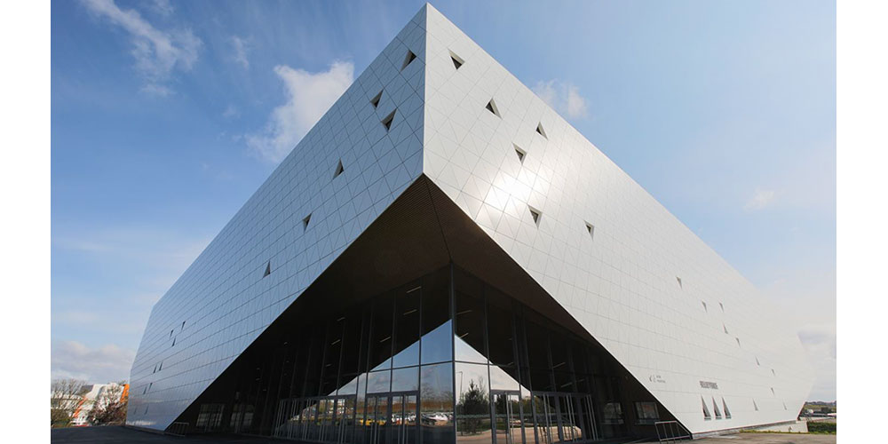 Murs-rideaux trapézoïdaux de l'Arena Futuroscope signés LOUINEAU