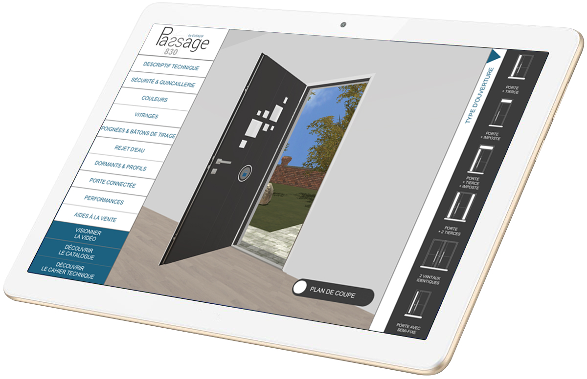 Au sein d’un seul outil, il est possible de visualiser la porte d’entrée en 3D dans ses différents types d’ouverture ou sous format « angle ». La personnalisation et les informations techniques n’auront plus de secrets pour vous (vitrages, couleurs, performances, porte connectée, etc.). Sont également inclus la vidéo de présentation, le catalogue interactif et le cahier technique. Le tout hors connexion et sans temps de chargement. Mise à disposition sur simple demande.