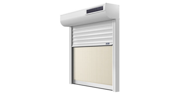 Équipé d’un store, d’une moustiquaire et d’un panneau solaire, le volet roulant motorisé à alimentation solaire de BATIM...