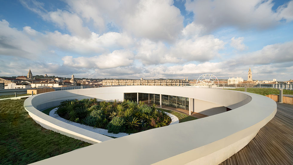 Concernant le Musée de la Romanité et ses enjeux urbains, l’important pour moi était de proposer un équipement ouvert qui participe à la désacralisation de la culture et de l’art, de faire pénétrer la ville dans le bâtiment et de créer au sein du bâtiment des espaces publics où les visiteurs et simples promeneurs pourraient se rencontrer. Le musée s’organise autour d’une rue intérieure qui suit les traces de l’ancien rempart augustéen et constitue un axe privilégié reliant le parvis des Arènes au jardin archéologique à l’arrière du site. Au cœur de ce passage, un large atrium révèle une reconstitution spectaculaire du propylée du Sanctuaire de la Fontaine, lieu sacré datant de la fondation de la cité à l’époque préromaine. Accessible à tous, il permet d’attirer les flux de passants du parvis des Arènes et invite à la découverte du musée et de ses collections.