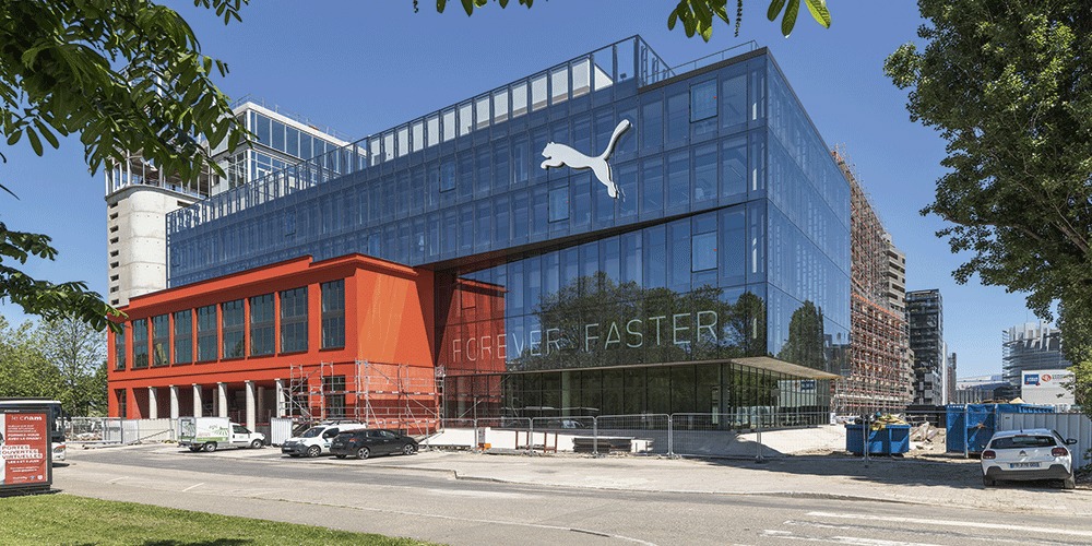 Les 4 200 m2 du nouveau siège de Puma ont été conçus par les équipes de DRLW architectes. Une grande structure en verre et de nombreux espaces sont dédiés au sport et au bien-être des salariés. Lumière et modularité sont les maîtres-mots de cette réalisation qui dispose de nombreux espaces de partage, des espaces dédiés au sport des salariés, des bureaux lumineux en open space, et pour finir, une salle de sport en rooftop avec vue sur Strasbourg. Visibles de l’extérieur, les salles d’activités et les terrains de sports placés au sommet du bâtiment illustrent les valeurs Puma : esprit de groupe, bien-être et dynamisme.