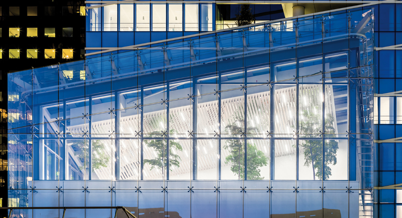 Dans cet édifice, le bien-être et le confort des utilisateurs – confort thermique, acoustique, visuel, qualité de l’air, modulaire/sécurité – répondent aux enjeux stratégiques ayant dicté la conception de la Tour dans une logique durable. Si les vitrages haute technologie participent de sa singularité esthétique à la façon d’un assemblage de cristaux et de jeux alternatifs de transparence ou de réflexion, leur process de diversification valide la performance énergétique du bâtiment. En quelque sorte, la luminosité en est le prisme et la performance énergétique, le Graal. Pour ce faire, socle et tête de la Tour se répondent autour d’un système de verre agrafé (VEA) qui permet d’augmenter la luminosité mais aussi d’intensifier l’impression de légèreté. Le corps de la Tour où sont concentrés les bureaux privilégie le confort visuel des occupants et l’efficacité énergétique avec différents vitrages. À l’extérieur, un simple vitrage de contrôle solaire se conjugue à un double vitrage à faible émissivité en intérieur afin de limiter les déperditions de chaleur vers l’extérieur. Cette isolation thermique assure ainsi une température intérieure agréable toute l’année, sans utilisation excessive de chauffage ou de climatisation. Composé d’un verre feuilleté acoustique et de sécurité, ce double vitrage fait également écran aux nuisances sonores extérieures, en particulier sur les façades surplombant le boulevard circulaire. La lame d’air de ce vitrage ventilé accueille quant à elle un store à des fins de protection solaire et de réduction des apports de chaleur en été.